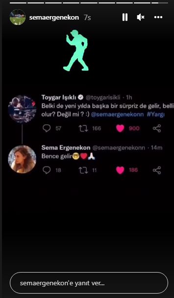 Ünlü müzisyen Toygar Işıklı, senarist Sema Ergenekon’u etiketleyerek “Belki de yeni yılda başka bir sürpriz de gelir. Belli mi olur? Değil mi?” ifadeleri ile paylaşımda bulundu. Ergenekon ise paylaşıma “Bence gelir” diyerek yanıt verdi. Işıklı ve Ergenkon’un konuşmaları, 2022 yılında Yargı dizisinin müzikleriyle ilgili izleyiciyi bir sürprizin beklediğini göstermiş oldular.