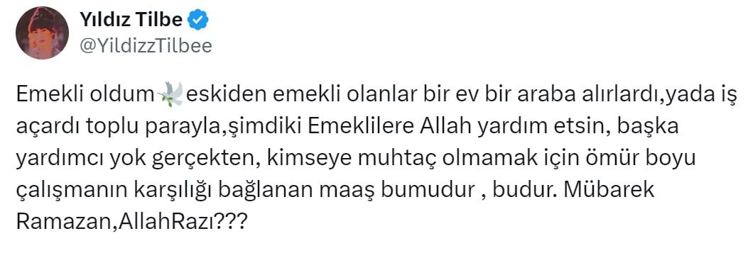 Eserleri ile milyonların sevgilisi olan yıldız sanatçı Yıldız Tilbe ; "Kimseye muhtaç olmamak için ömür boyu çalışmanın karşılığı bağlanan maaş bu mudur, budur. Mübarek Ramazan, Allah razı?" ifadeleri ile ömür boyu çalışarak hak edilen maaşın komik seviyelerde olduğunu vurguladı. Yıldız Tilbe'nin bu haklı isyanına beğeni ve yorum yağdı.