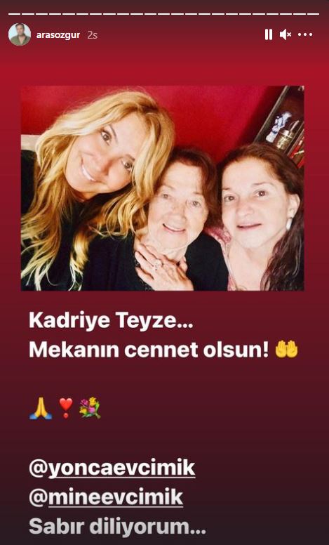 Ünlü sanatçı Yonca Evcimik'in annesi Kadriye Evcimik vefat etti. Yonca Evcimik için acı bir gün yaşanıyor. Son günlerde farklı bölgelerde yaşanan yangınlar nedeniyle birçok ünlü isim gibi Yonca Evcimik de paylaşımlar yapıyordu. Sosyal medya hesabından günlerdir yardım çağrılarını duyuran Yonca Evcimik bugün acı bir haberle uyandı. Annesi Kadriye Evcimik vefat etti. Kadriye Evcimik'in vefat haberi ise ünlü danışman Özgür Aras'ın paylaşımıyla verildi. Özgür Aras Yonca Evcimik ve annesinin birlikte olduğu fotoğrafı paylaşarak sabırlar diledi.