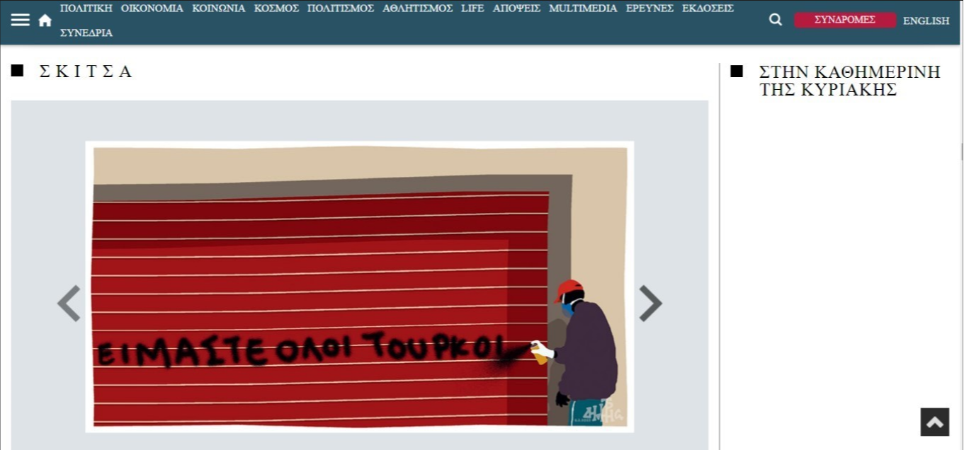 Bilindiği gibi komşu Yunanistan, depremi duyar duymaz, Türkiye'ye 21 kişilik yardım ekibi, özel eğitim almış iki köpek, kurtarma faaliyetlerinde kullanılacak özel ekipman, beş doktor gönderdi. Bu arada Yunanistan'da da medya deprem felaketini manşete taşıdı. Ülkenin önde gelen gazetelerinden Kathimerini, 7.7 ve 7.6 büyüklüğündeki depremlere ilişkin bir karikatür yayımladı.Türk halkının yanında olduklarını vurgulayan Kathimerini “Hepimiz Türküz” ifadesine yer verdi.bu anlamlı karikatür, ahlaksız Fransız bir gazetede çıkan karikatüre en güzel cevap olarak değerlendirildi.