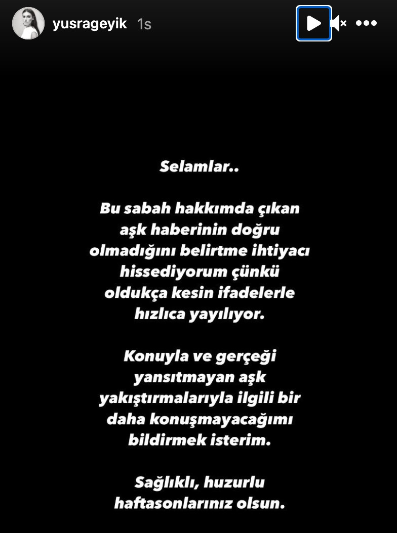 Oyuncu Yüsra Geyik haklarında çıkan haberlerle ilgili bir açıklama yaptı. İnstagram hesabından bir not paylaşan Yüsra Geyik "Aşk haberinin doğru olmadığını belirtme ihtiyacı hissediyorum" ifadelerini kullandı. Yüsra Geyik, "Selamlar… Bu sabah hakkımda çıkan Aşk haberinin doğru olmadığını belirtme ihtiyacı hissediyorum çünkü oldukça kesin ifadelerle hızlıca yayılıyor. Konuyla ve gerçeği yansıtmayan aşk yakıştırmalarıyla ilgili bir daha konuşmayacağımı bildirmek isterim. Sağlıklı huzurlu hafta sonlarınız olsun" paylaşımında bulundu. Güzel oyuncu Yüsra Geyik'in Rıza Kocaoğlu'nun çektiği bir fotoğrafı paylaşması da iddiaları güçlendirmişti. Fakat Yüsra Geyik son yaptığı sosyal medya paylaşımında Rıza Kocaoğlu ile ilişkisini net bir şekilde yalanladı.