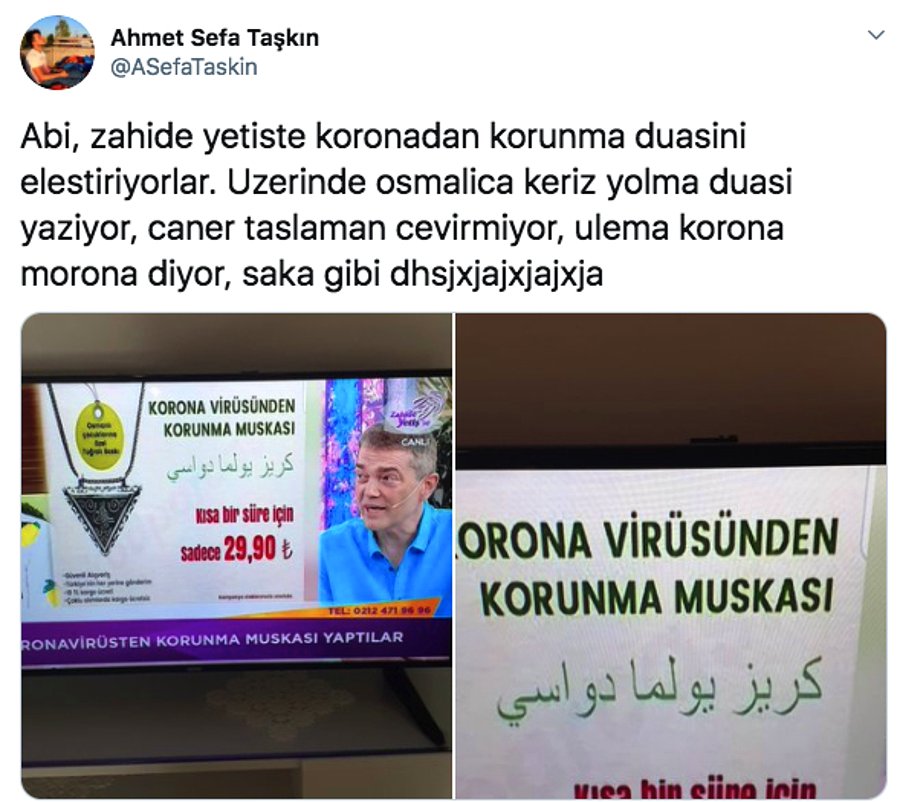 Show TV’nin sabah kuşağında ekrana getirdiği Zahide Yetiş’le programında ünlü sunucunun ve konuğunun çok basit bir ibareyi okuyamaması ancak okumuş gibi yapıp derin anlamlar vermesi geldiğimiz nokta açısından tam bir kara mizah örneğiydi. Üstelik her gün ekranlardan din şarlatanlarının foyası meydana çıkarılırken Zahide Yetiş ve ilahiyat profesörünün adeta sahte ürünün dakikalarca reklamını yapması ekran başındaki duyarlı vatandaşları kahretti. Üstelik duyarlı vatandaşlar ekranın alt köşesinde verilen whatsaapp numarasını aramalarına rağmen bir türlü düşüremediler. Tam olarak “Keriz yolma duası” yazan muskayı “korona koruma devası” gibi okuyan sözüm ona ilahiyat profesörü ise adeta pes dedirtti. Kuran alfabesini bilen bir çocuğun bile rahatlıkla okuyabileceği "Keriz yolma duası" yazan ibareyi okuyamayan ama okumuş gibi yaparak reklamını yapan Zahide Yetiş ve ilahiyat profesörü farkında olmayarak “Coronavirüsten korunma duası' adı altında insanların dini duygularını kullanarak dolandırıcılık yapan kişilerin oyununa gelmiş oldu. Arapça harflerle 'keriz yolma duası' yazan ve “coronavirüs'tren korunma muskası” olarak pazarlanan sahte ürünü “çok ucuzmuş” diyerek reklamını yapan Zahide Yetiş böylece bir skandala imza atmış oldu. Zahide Yetiş “Coronavirüse iyi geliyormuş. Muska, 10 TL kargo bedeliyle 29.90 TL'ye pazarlanıyor. Çok ucuzmuş” diyerek adeta dolandırıcılara çanak tutması sosyal medyada hem alay vesilesi oldu hem de skandal olarak ifşa edildi.