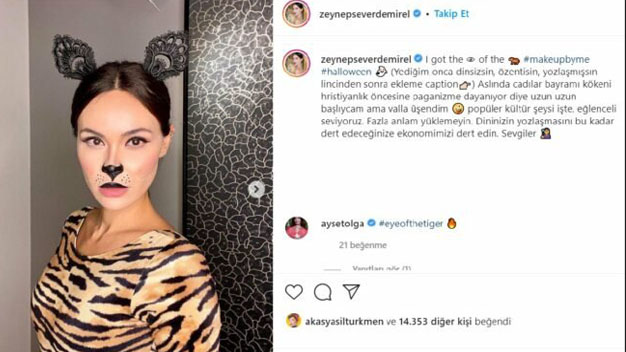 Cadılar Bayramı tüm dünyada başta Hıristiyan ülkeler olmak üzere kutlanırken ne yazık ki gösterilerde bu sene kan aktı ve pek çok insan hayatını kaybetti. Yaşanılan izdihamlar sebebiyle bu kayıplar yaşanırken bu durum kutlamalara pek fazla gölge düşürmedi. Ülkemizde de kutlamalar yapılırken bu kutlamaları yapanlardan biride ünlü futbolcu Volkan Demirel’in eşi Zeynep Demirel oldu. Zeynep Demirel sosyal medya hesabından kostümüyle çekilmiş resimlerle paylaşım yaparken pek çok eleştiri geldi. Ünlü isim bunun üzerine eleştirilere yine sosyal medya hesabından cevap verdi. Zeynep Demirel paylaşımında “Aslında Cadılar bayramı kökeni Hıristiyanlık öncesine paganizme dayanıyor diye uzun uzun başlayacağım ama vallahi üşendim. Popüler kültür şeyi işte. Eğlenceli, seviyoruz. Fazla anlam yüklemeyin. Dininizin yozlaşmasını dert edeceğinize ekonomimizi dert edin. Sevgiler” ifadelerini kullandı. Ünlü ismin bu tepki paylaşımına yine pek çok sert yorum yapıldı ve bu paylaşımda tepkiyle karşılandı.