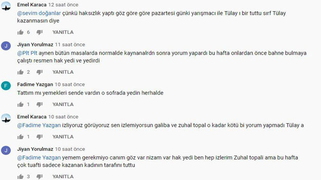 Zuhal Topal’la Sofrada’nın son haftasında sunucu Zuhal Topal’ın tatlısını buzdolabında unutan ve kayınvalidelere donmuş tiramisu servis eden yarışmacıya 9 puan vermesi sosyal medyada yoğun bir şekilde eleştirildi. Seyirciler ve sosyal medya kullanıcıları Zuhal Topal’ı haksızlık yaptığı iddialarıyla eleştirdi. İşte o mesajlardan bazıları: “Zuhal Hanım siz herkesin puanını nasıl olsa biliyorsunuz, ona göre kazandırıyorsunuz”, “Kaynanalar düşük puan verince Zuhal Topal, kötü yönde eleştirisine rağmen 8 verdi, çünkü kazananı belirledi”, “Artık seyretmiyorum, haksızlık yaptı Zuhal Topal. Tatlısı olmayana 9 verdi, taraf tutuyor. Bu kadar olmaz”, “Zuhal hanım hal eden kazansın diye uğraşıyor, o yüzden düşük veya yüksek veriyor. Çünkü kayınvalideler rakip görüp kötü puan veriyorlar.” Bu eleştiriler karşısında program yapımcısı veya sunucu Zuhal Topal bir açıklama yapacak mı bilinmiyor. Ama eğer bir açıklama yaparsa mutlaka sizlere bildireceğiz.